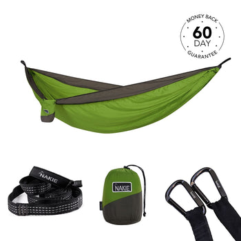 2 × Double HammockDimensions: 3m × 1.8mWeight rating: 225kgWeight: 600g 4 × Hammock StrapsLength: 2.3m per strapWeight rating: 450kgWeight: 130g...