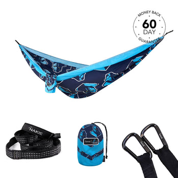 NRL Cronulla Sharks x Nakie Double HammockDimensions: 3m × 1.8mWeight rating: 225kgWeight: 600g 2 × Hammock StrapsLength: 2.3m per strapWeight r...