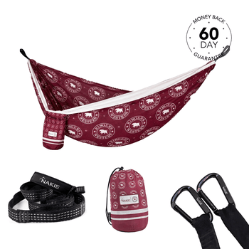 View full detailsJust yourself and two trees! Each Nakie hammock comes standard with no knot straps and carabiners for an easy no fuss set up. You do not need any extra equipment. Setting up your own hammock is very easy. Our current record is 27 seconds! With our no fuss straps and carabiners you won’t need to tie a single knot. Setting up a Nakie hammock is straightforward. Here’s how to do it in a few simple steps: - Find Two Anchor Points: Look for two sturdy trees (or posts) about 10-15 feet apart. Ensure they’re healthy and can support your weight—trees should be at least 6 inches in diameter to avoid damage or risk - Loop the Straps: Take the provided tree straps and wrap each one around a tree at about head height (around 5-6 feet up). Feed the end of the strap through its own loop and pull tight to secure it. Nakie hammocks come with reinforced straps designed to be tree-friendly, so they won’t harm the bark. - Attach the Hammock: Clip each end of the hammock to the straps using the included carabiner clips. Nakie straps have multiple loops, so you can adjust the tension by choosing different loops—start with one in the middle. - Test and Adjust: Sit in the hammock to check the height and comfort. The middle should hang about hip level, with the ends at head height, to create a cozy curve. If it’s too low or tight, adjust the clips on the straps or raise/lower the straps on the trees.